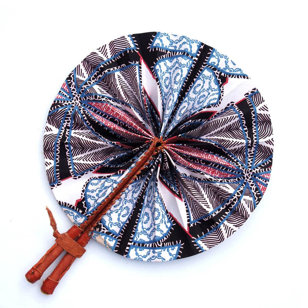 扇面にアフリカ色豊かなアフリカンプリント綿布を使い、柄には高級感の漂う羊皮を巻いた折りたたみうちわ。団扇の仰ぎやすさや強い風と扇子の持ち運びやすさやデザイン性を兼ね備えたハイブリッドうちわ。ガーナ職人がひとつひとつ丁寧に手づくりしました。