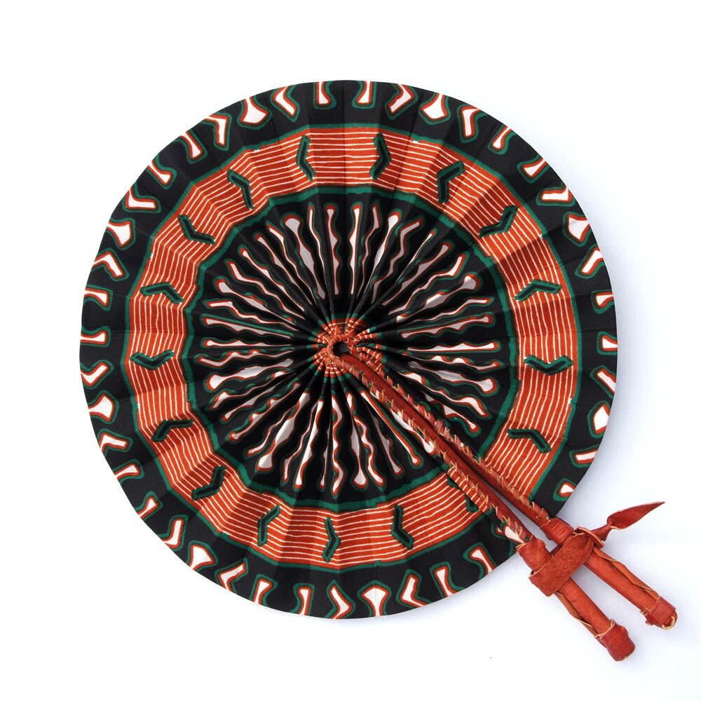 扇面にアフリカ色豊かなアフリカンプリント綿布を使い、柄には高級感の漂う羊皮を巻いた折りたたみうちわ。団扇の仰ぎやすさや強い風と扇子の持ち運びやすさやデザイン性を兼ね備えたハイブリッドうちわ。ガーナ職人がひとつひとつ丁寧に手づくりしました。