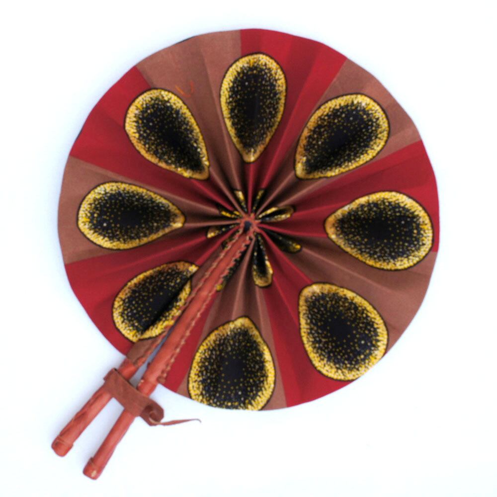 扇面にアフリカ色豊かなアフリカンプリント綿布を使い、柄には高級感の漂う羊皮を巻いた折りたたみうちわ。団扇の仰ぎやすさや強い風と扇子の持ち運びやすさやデザイン性を兼ね備えたハイブリッドうちわ。ガーナ職人がひとつひとつ丁寧に手づくりしました。