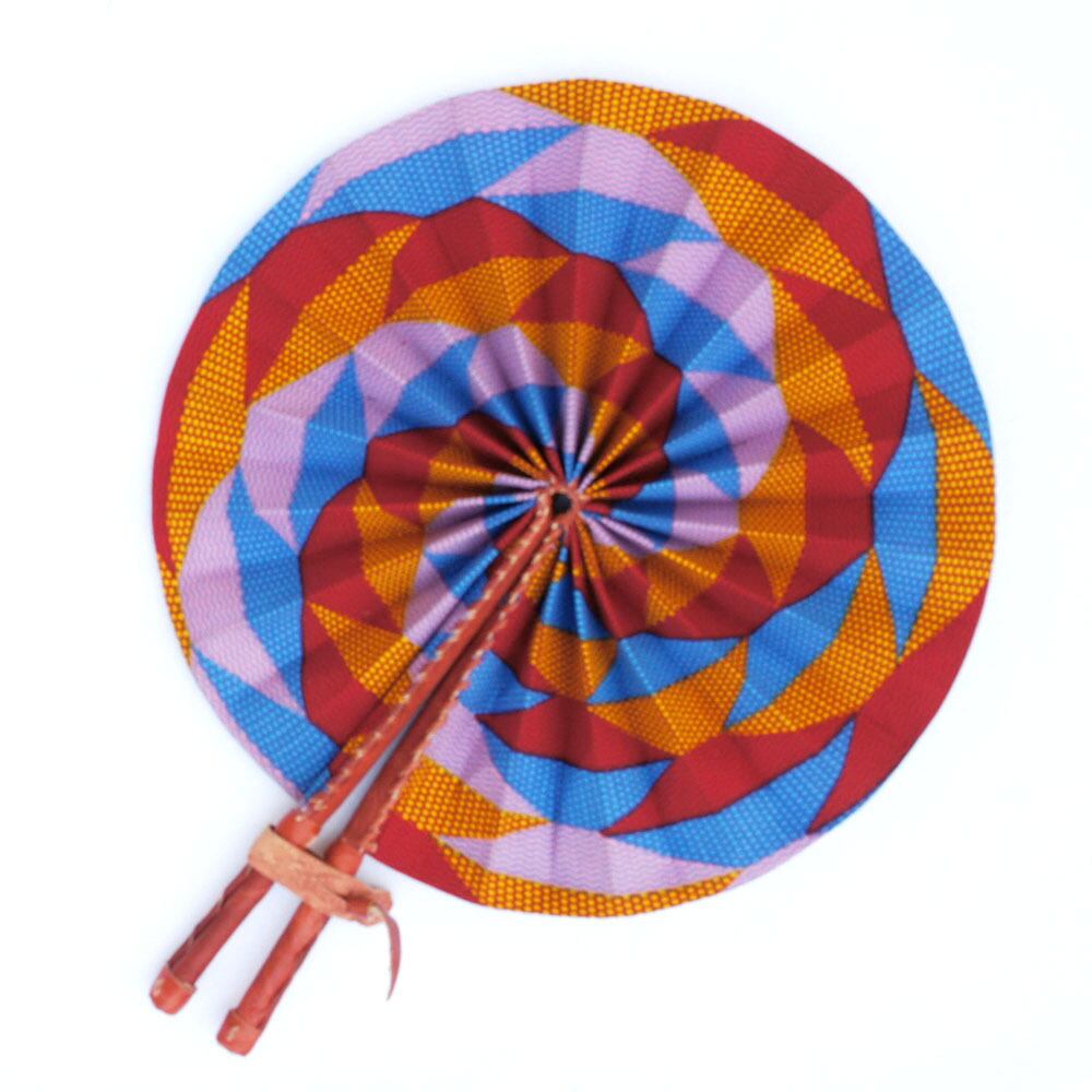 扇面にアフリカ色豊かなアフリカンプリント綿布を使い、柄には高級感の漂う羊皮を巻いた折りたたみうちわ。団扇の仰ぎやすさや強い風と扇子の持ち運びやすさやデザイン性を兼ね備えたハイブリッドうちわ。ガーナ職人がひとつひとつ丁寧に手づくりしました。