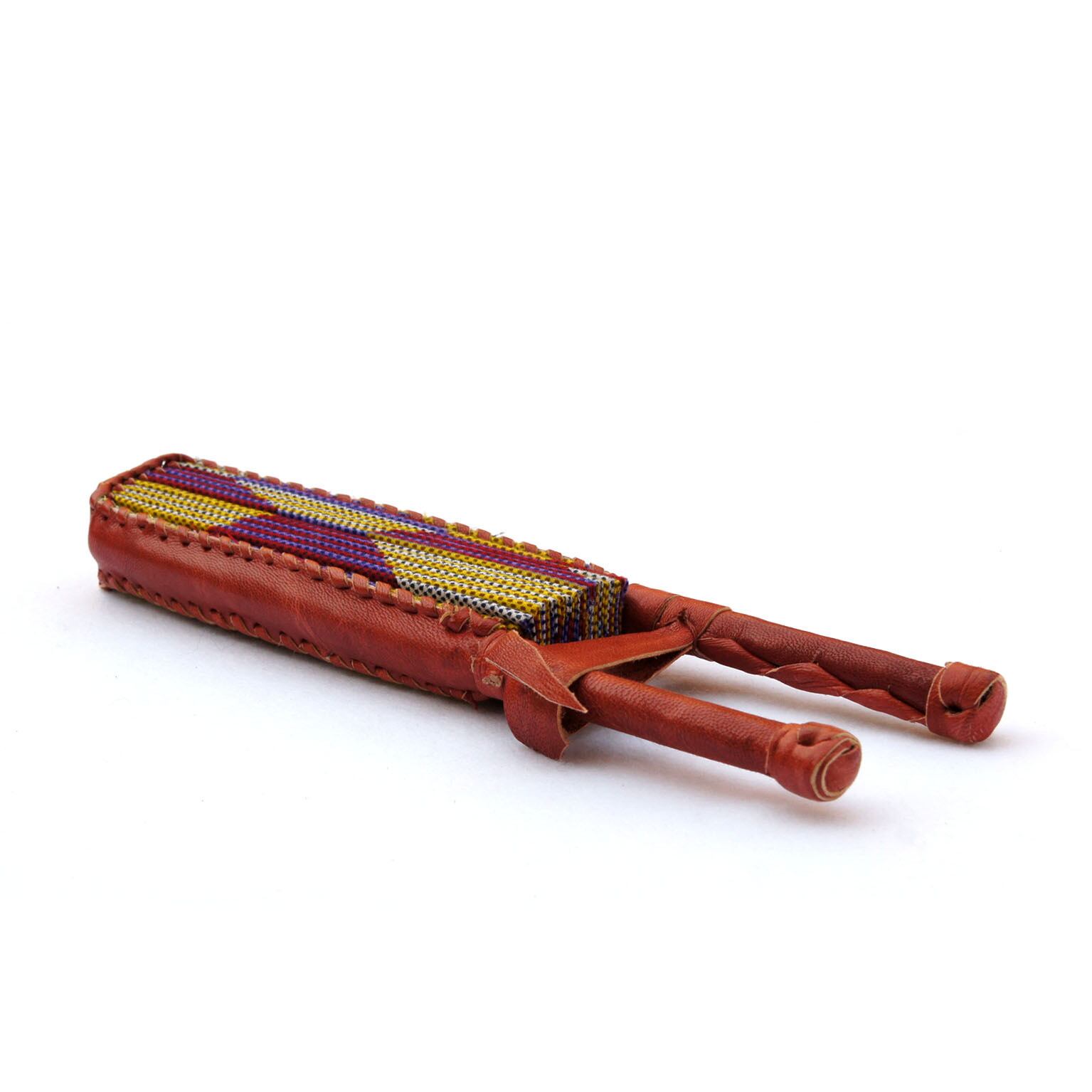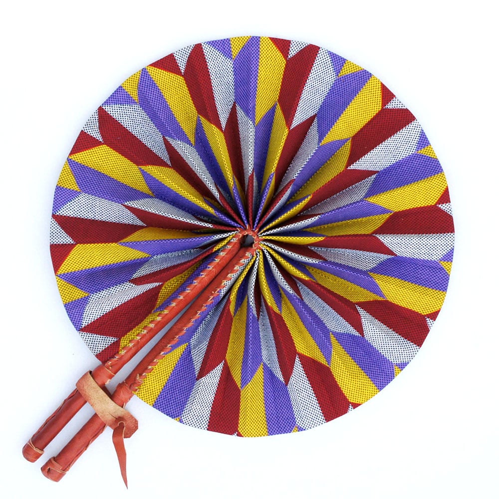 扇面にアフリカ色豊かなアフリカンプリント綿布を使い、柄には高級感の漂う羊皮を巻いた折りたたみうちわ。団扇の仰ぎやすさや強い風と扇子の持ち運びやすさやデザイン性を兼ね備えたハイブリッドうちわ。ガーナ職人がひとつひとつ丁寧に手づくりしました。